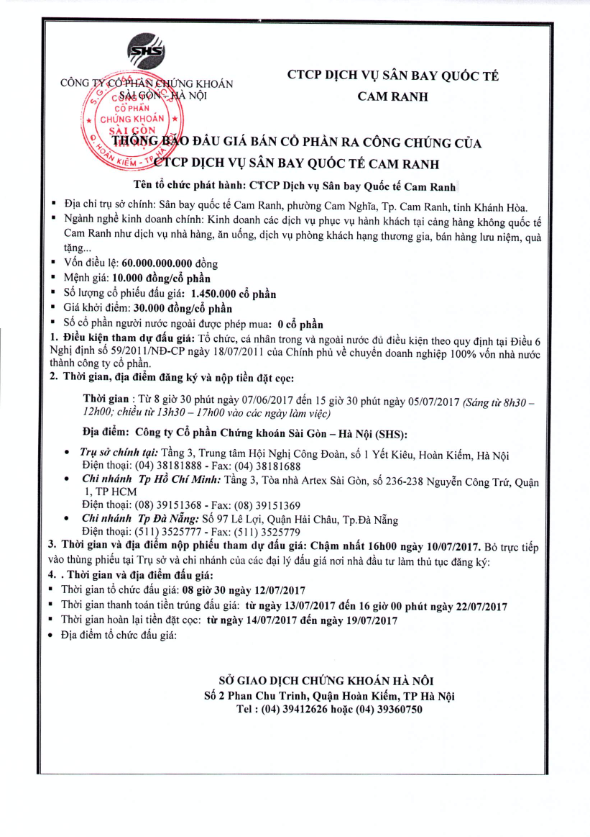 Thông báo đấu giá bán cổ phần CTCP Dịch vụ Sân bay Quốc tế Cam Ranh