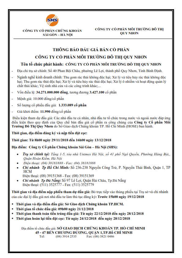 Thông báo đấu giá bán cổ phần CTCP Môi trường đô thị Quy Nhơn