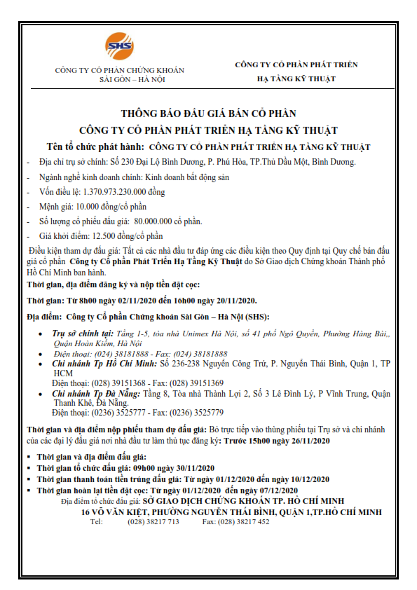 Thông báo đấu giá bán cổ phần CTCP Phát triển hạ tầng kỹ thuật