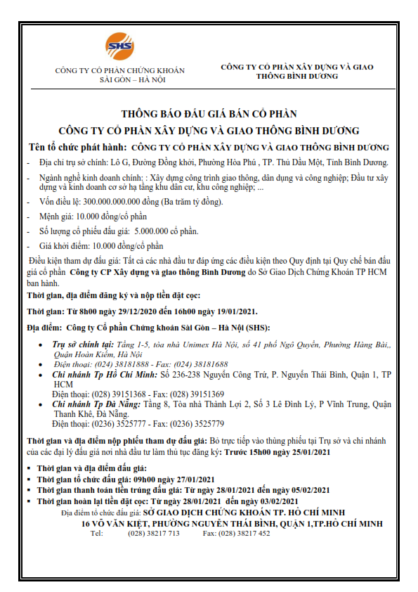 Thông báo đấu giá bán cổ phần CTCP Xây Dựng và Giao thông Bình Dương
