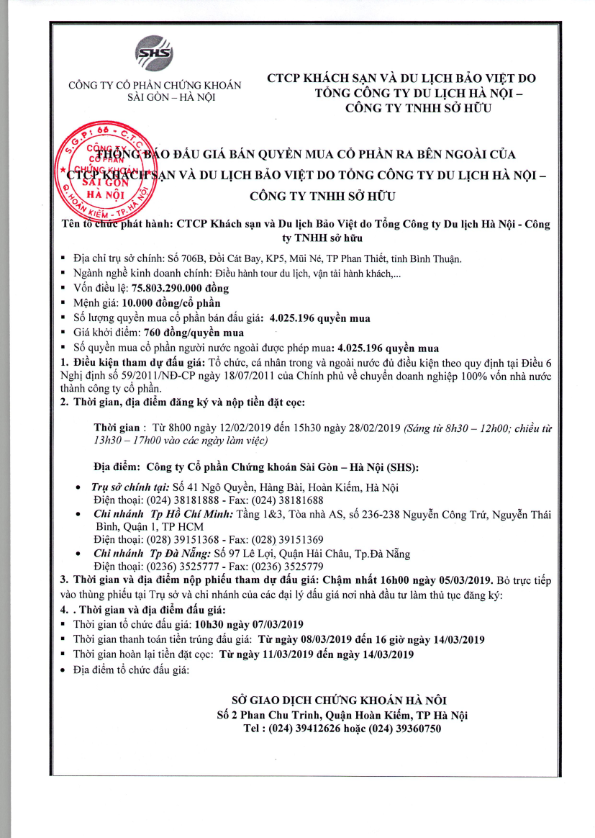 Thông báo đấu giá bán cổ phần của CTCP Khách sạn và du lịch Bảo Việt do Tổng công ty du lịch Hà Nội - Công ty TNHH sở hữu