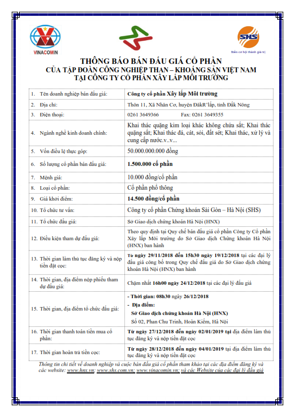 - Thông báo đấu giá bán cổ phần ra công chúng của CTCP Xây lắp môi trường do tập đoàn Than-Khoáng sản Việt Nam sở hữu - 29/11/2018