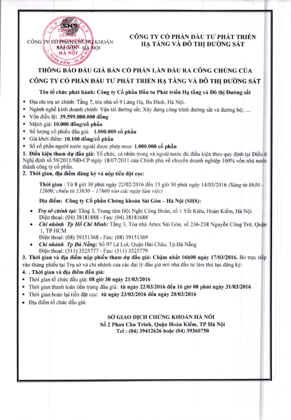 Thông báo đấu giá bán cổ phần lần đầu ra công chúng của công ty Cổ phần Đầu tư phát triển hạ tầng và đô thị đường sắt
