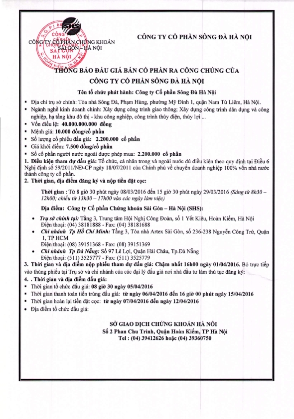 - Thông báo đấu giá bán cổ phần lần đầu ra công chúng của Công ty cổ phần Sông Đà Hà Nội - 17/03/2016