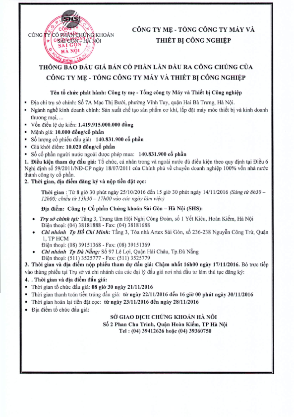Thông báo đấu giá bán cổ phần lần đầu ra công chúng của công ty mẹ - Tổng công ty máy và thiết bị công nghiệp