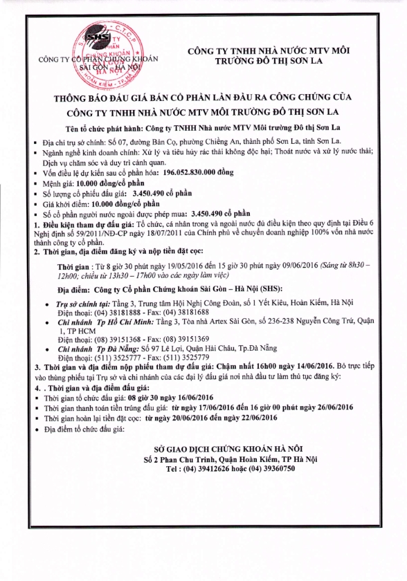Thông báo đấu giá bán cổ phần lần đầu ra công chúng của công ty THHH Nhà nước MTV Môi trường đô thị Sơn La