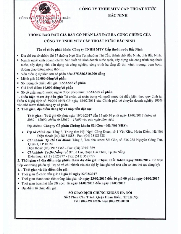 Thông báo đấu giá bán cổ phần lần đầu ra công chúng của Công ty TNHH MTV Cấp thoát nước Bắc Ninh