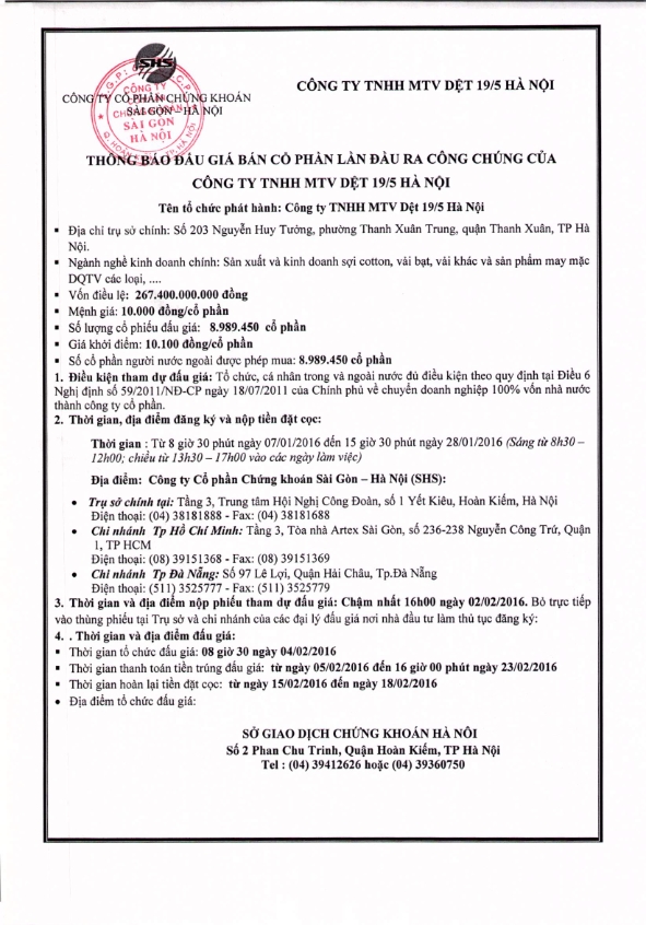 Thông báo Đấu giá bán Cổ phần lần đầu ra Công chúng của Công Ty TNHH MTV Dệt 19/5 Hà Nội.