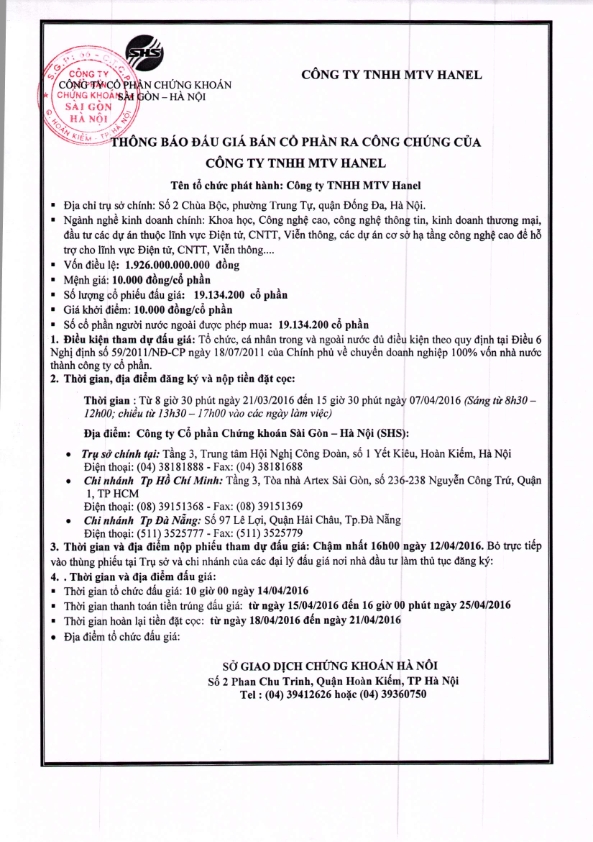 Thông báo đấu giá bán cổ phần lần đầu ra công chúng của Công ty TNHH MTV Hanel