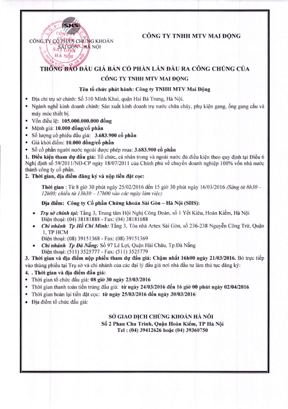 Thông báo đấu giá bán cổ phần lần đầu ra công chúng của Công ty TNHH MTV Mai Động