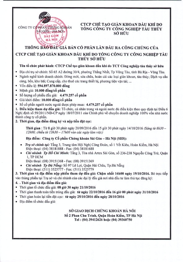 Thông báo đấu giá bán cổ phần lần đầu ra công chúng của CTCP Chế tạo giàn khoan do tổng công ty công nghiệp tầu thủy sở hữu