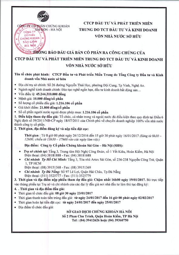 Thông báo đấu giá bán cổ phần lần đầu ra công chúng của CTCP Đầu tư và phát triển miền trung do TCT đầu tư và kinh doanh vốn nhà nước sở hữu
