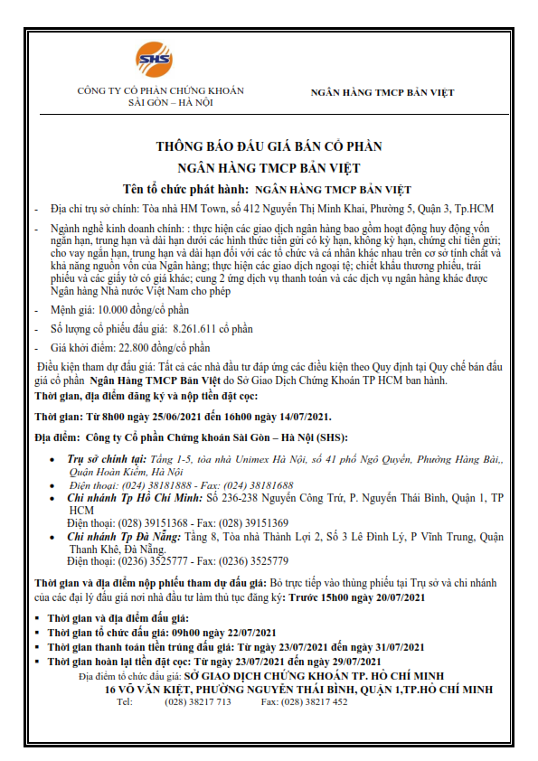 Thông báo đấu giá bán cổ phần Ngân hàng TMCP Bản Việt