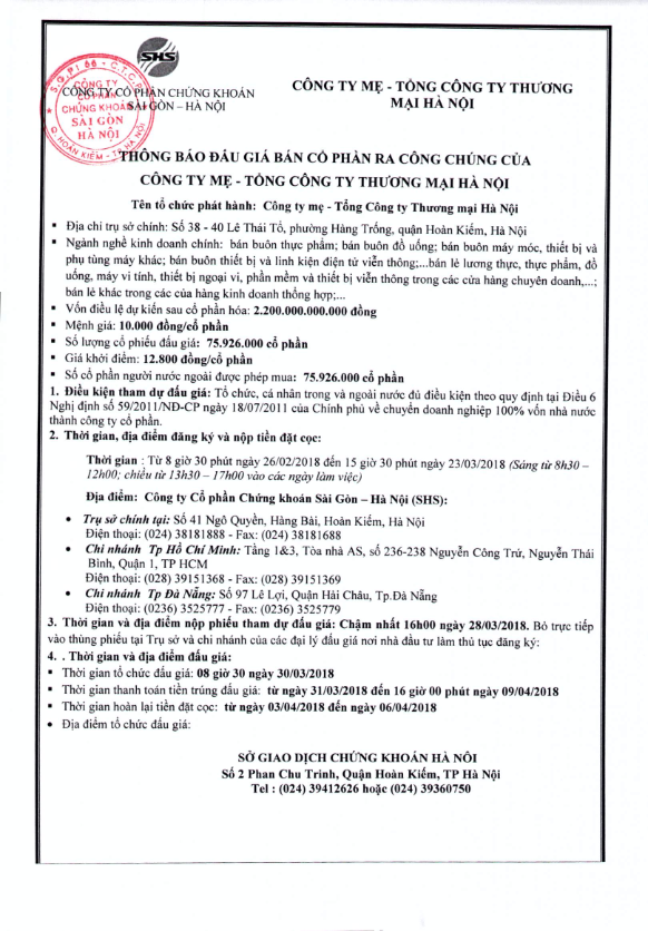 Thông báo đấu giá bán cổ phần ra công chúng của công ty mẹ - Tổng công ty Thương mại Hà nội