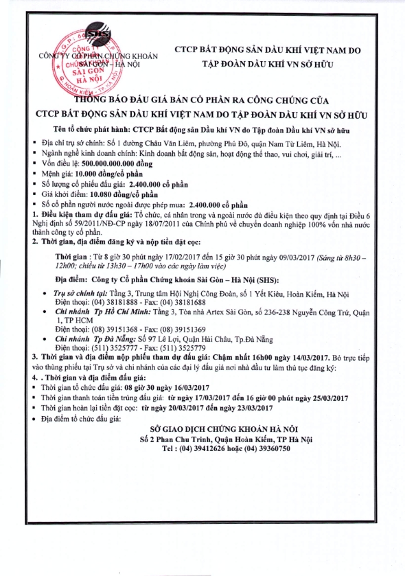 Thông báo đấu giá bán cổ phần ra công chúng của CTCP bất động sản dầu khí Việt Nam do tập đoàn dầu khí Việt Nam sở hữu