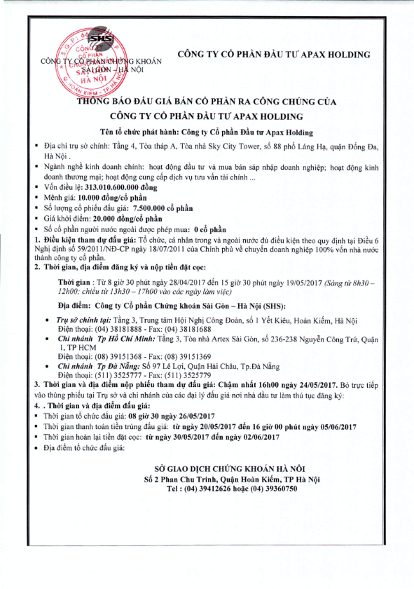 Thông báo đấu giá bán cổ phần ra công chúng của CTCP Đầu tư Apax Holding