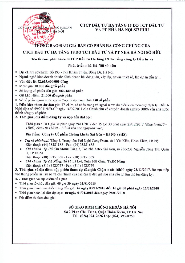 Thông báo đấu giá bán Cổ phần ra công chúng của CTCP Đầu tư hạ tầng 18