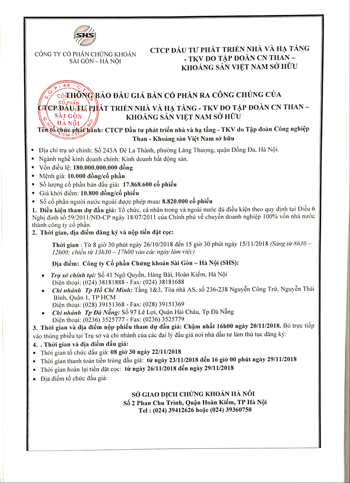- Thông báo bán đấu giá cổ phần của Tập đoàn Công nghiệp than – Khoáng sản Việt Nam tại Công ty CP Đầu tư phát triển nhà và hạ tầng - TKV - 25/10/2018