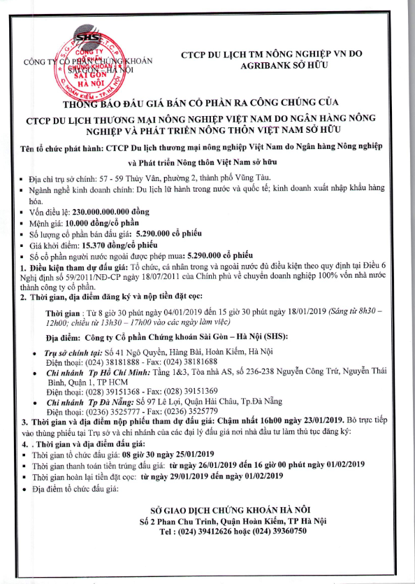 Thông báo đấu giá bán cổ phần ra công chúng của CTCP Du lịch thương mại nông nghiệp Việt Nam do ngân hàng nông nghiệp và phát triển nông thôn Việt Nam sở hữu