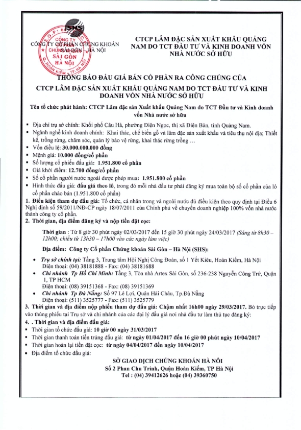 Thông báo đấu giá bán cổ phần ra công chúng của CTCP Lâm đặc sản Xuất khẩu Quảng Nam do TCT Đầu tư và Kinh doanh vốn Nhà nước sở hữu