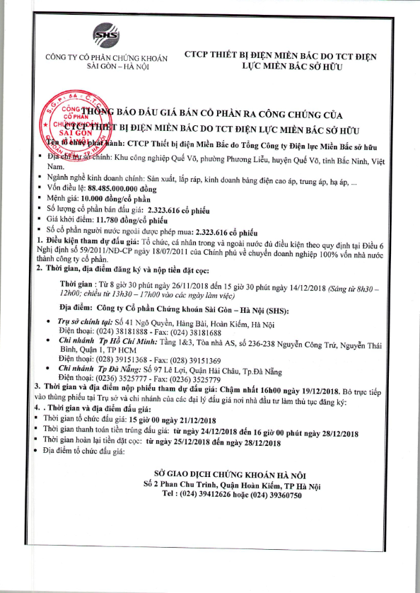 Thông báo đấu giá bán cổ phần ra công chúng của CTCP Thiết bị điện miền bắc do TCT Điện lực miền bắc sở hữu