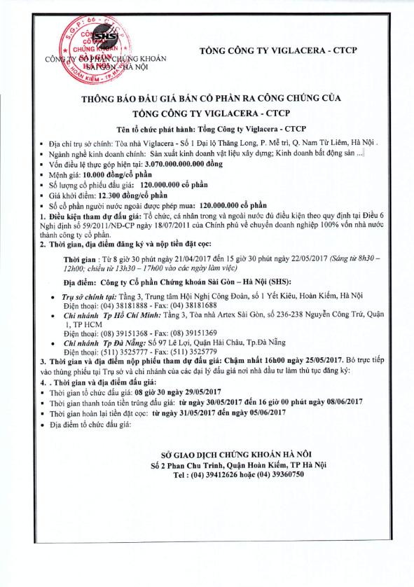 Thông báo đấu giá bán cổ phần ra công chúng của Tổng công ty Viglacera - CTCP