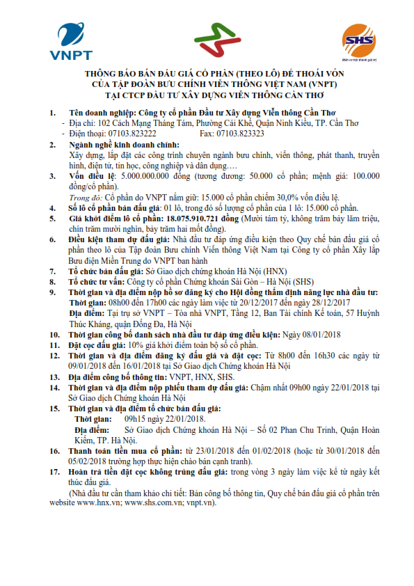- Thông báo đấu giá bán cổ phần Tập đoàn VNPT tại CTCP Tư vấn đầu tư và phát triển Bưu điện Hà Nội - 19/12/2017