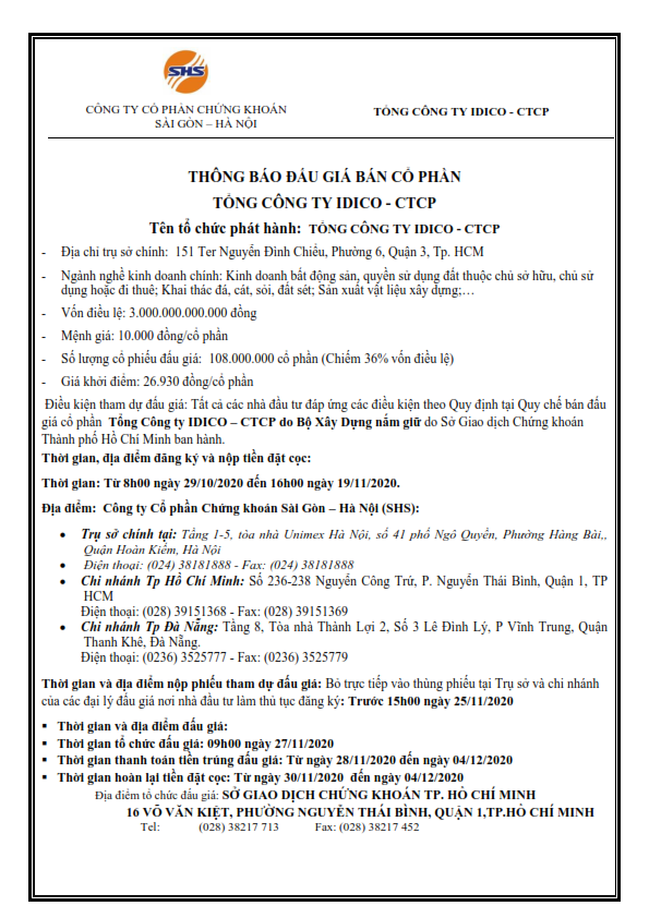 Thông báo đấu giá bán cổ phần Tổng công ty IDICO - CTCP