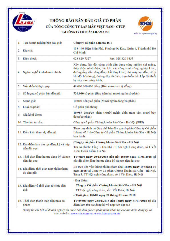 Thông báo đấu giá bán cổ phần Tổng công ty lắp máy Việt Nam tại CTCP Lilama 45.1