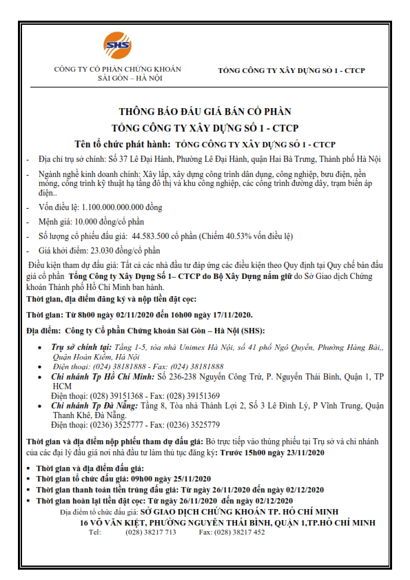 Thông báo đấu giá bán cổ phần Tổng công ty Xây dựng số 1 - CTCP