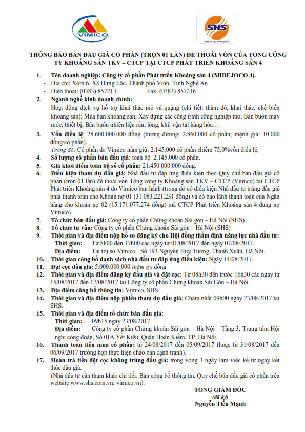 Thông báo đấu giá bán cổ phần (trọn 1 lần) để thoái vốn của Tổng công ty Khoáng sản TKV - CTCP tại CTCP phát triển khoáng sản 4