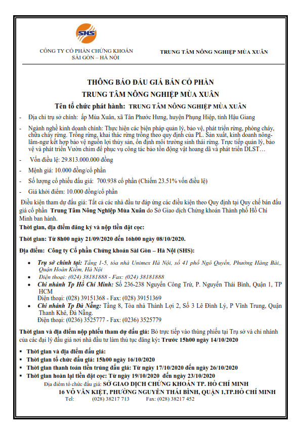 Thông báo đấu giá bán cổ phần Trung Tâm Nông Nghiệp Mùa Xuân