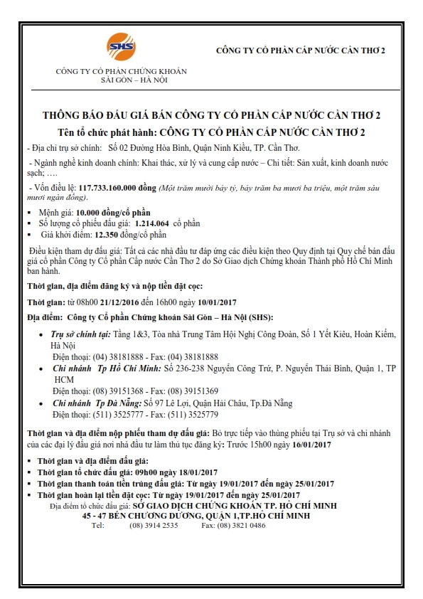 THÔNG BÁO ĐẤU GIÁ BÁN CÔNG TY CỔ PHẦN CẤP NƯỚC CẦN THƠ 2