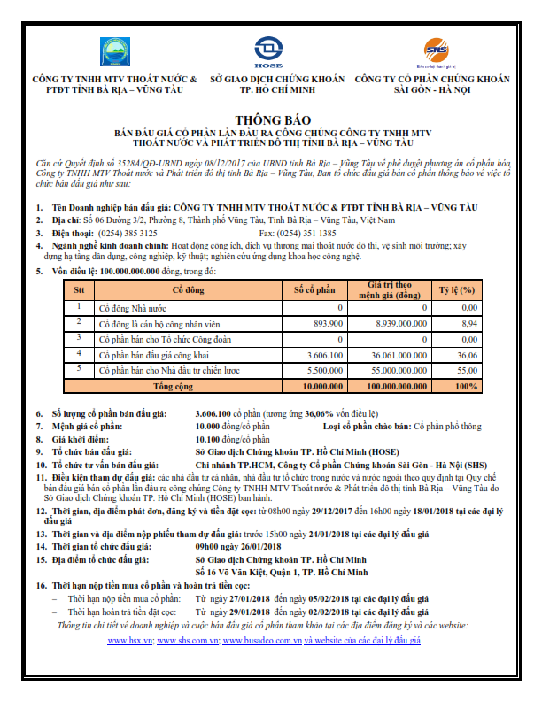 Thông báo đấu giá bán Công ty TNHH MTV Thoát nước và phát triển đô thị tỉnh Bà rịa - Vũng tàu