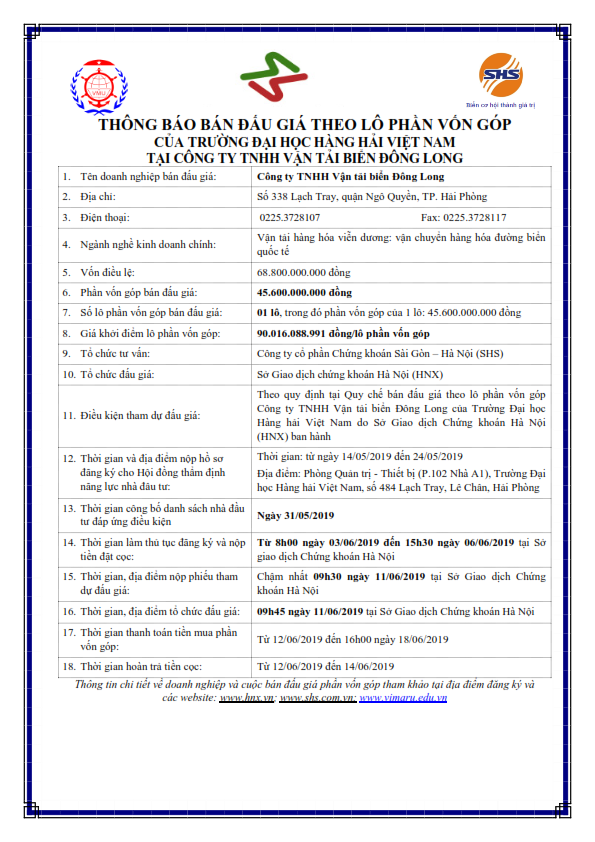 Thông báo đấu giá bán theo lô phần góp vốn của trường đại học Hàng Hải Việt Nam tại Công ty TNHH Vận tải biển Đông Long