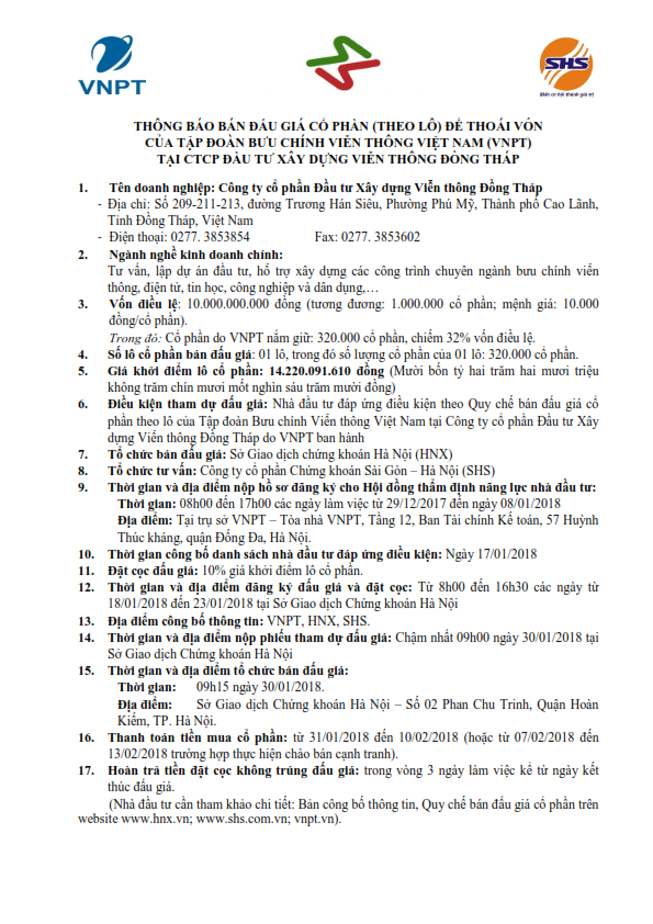 - Thông báo đấu giá bán VNPT Tại CTCP Xây lắp Bưu điện Huế - 28/12/2017