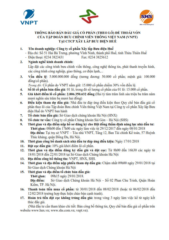 Thông báo đấu giá bán VNPT Tại CTCP Xây lắp Bưu điện Huế