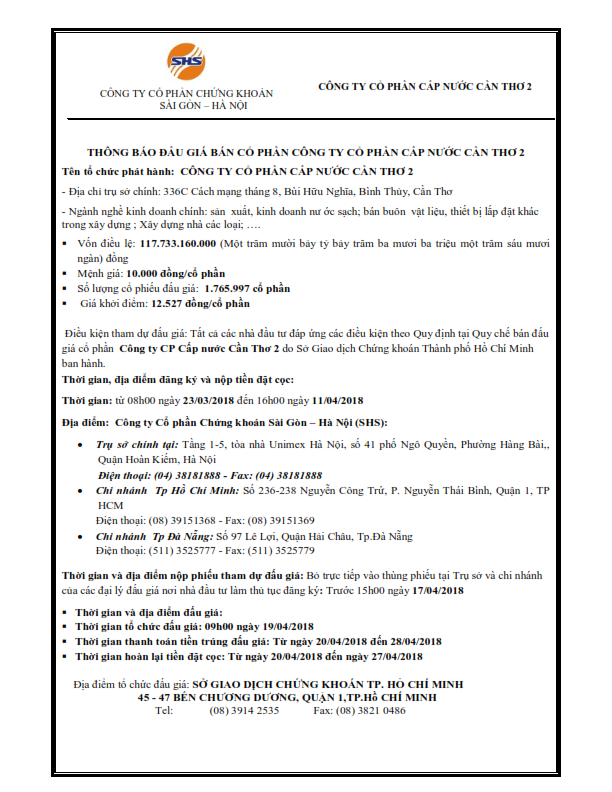 Thông báo đấu giá Công ty cổ phần Cấp nước Cần Thơ 2