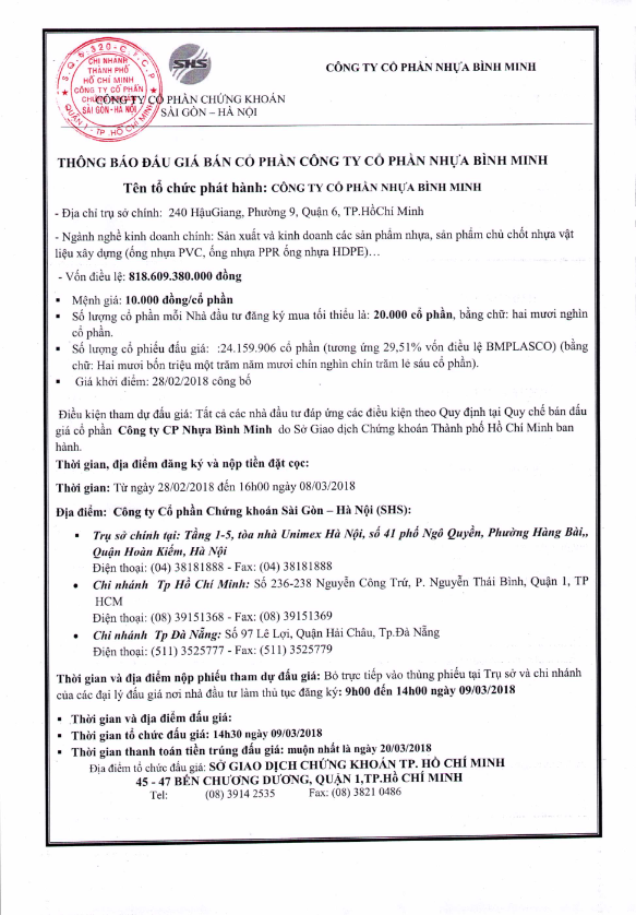 Thông báo đấu giá Công ty CP Nhựa Bình Minh