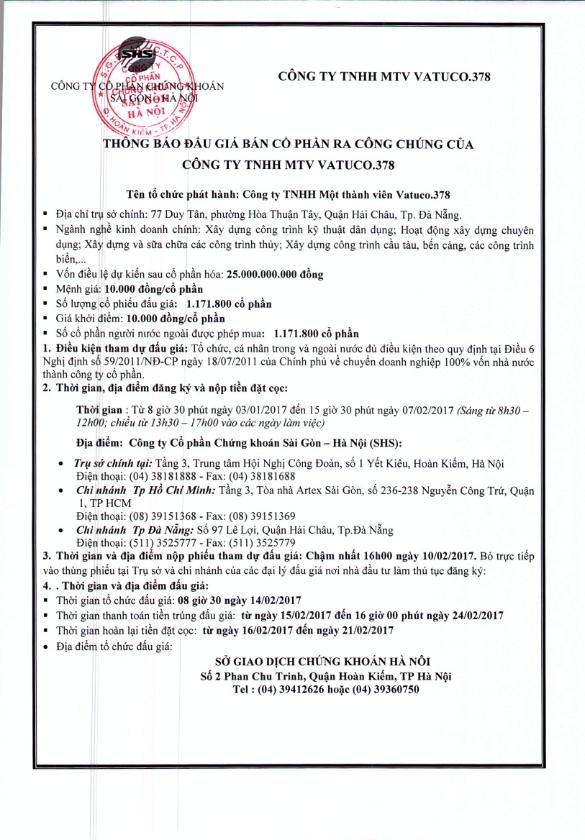 Thông báo đấu giá Công ty TNHH Một thành viên Vatuco.378
