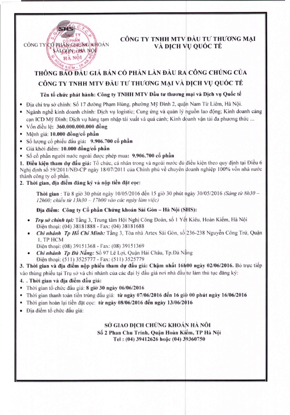 Thông báo đấu giá Công ty TNHH MTV đầu tư thương mại và Dịch vụ Quốc tế