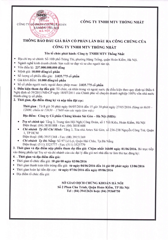 - Thông báo bán đấu giá bán cổ phần ra Công chúng của Tổng Công Ty Thiết bị Y Tế Việt Nam - 05/04/2016