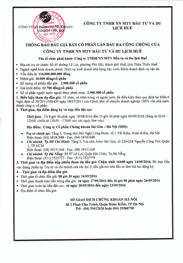 Thông báo đấu giá Công ty TNHH NN MTV Đầu tư và Du lịch Huế