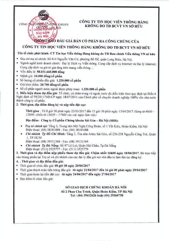 Thông báo đấu giá CT Tin học Viễn thông Hàng không do TĐ Bưu chính Viễn thông VN sở hữu