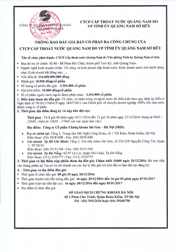 Thông báo đấu giá CTCP Cấp thoát nước Quảng Nam do VP Tỉnh ủy Quảng Nam sở hữu