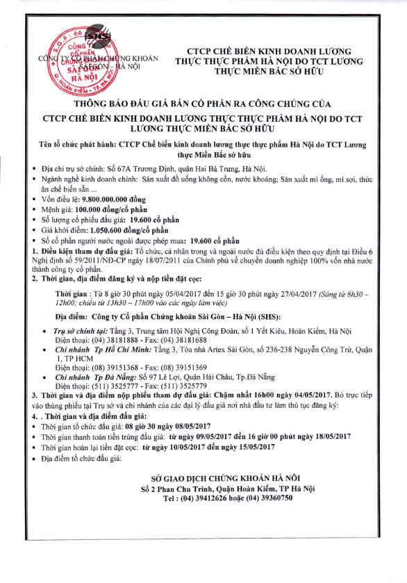 Thông báo đấu giá CTCP Chế biến kinh doanh lương thực thực phẩm Hà Nội do TCT Lương thực Miền Bắc sở hữu