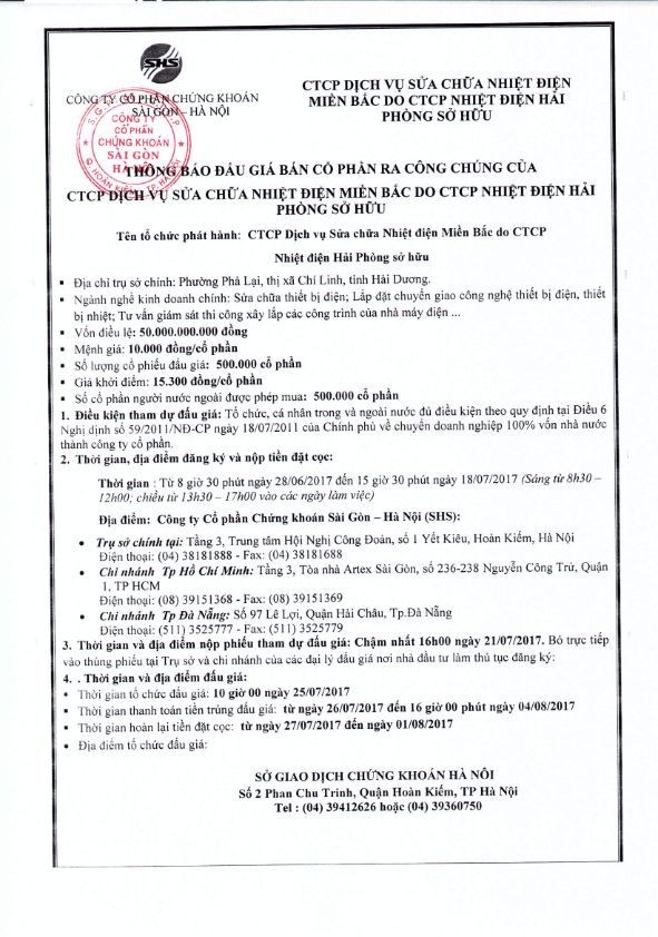 Thông báo đấu giá CTCP Dịch vụ Sửa chữa Nhiệt điện Miền Bắc do CTCP Nhiệt điện Hải Phòng sở hữu