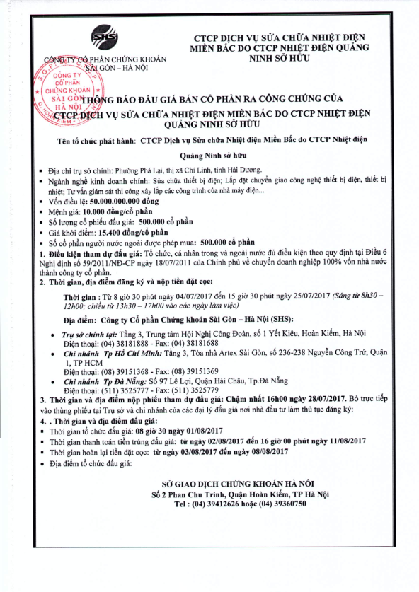 Thông báo đấu giá CTCP Dịch vụ Sửa chữa Nhiệt điện Miền Bắc do CTCP Nhiệt điện Quảng Ninh sở hữu