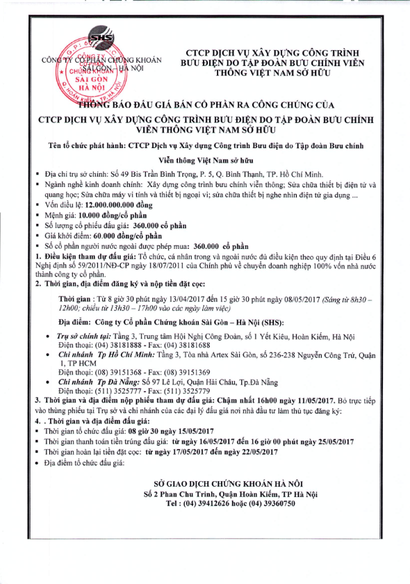 - THÔNG BÁO BÁN ĐẤU GIÁ CỔ PHẦN CỦA TẬP ĐOÀN BƯU CHÍNH VIỄN THÔNG VIỆT NAM TẠI CÔNG TY CỔ PHẦN DỊCH VỤ XÂY DỰNG CÔNG TRÌNH BƯU ĐIỆN - 12/04/2017