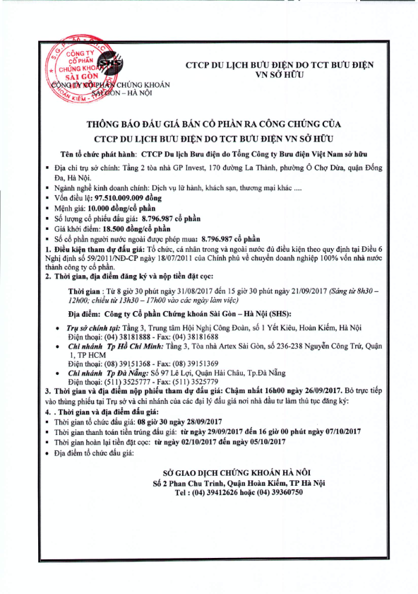 Thông báo đấu giá CTCP Du lịch Bưu điện do Tổng Công ty Bưu điện Việt Nam sở hữu